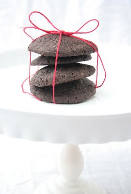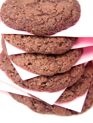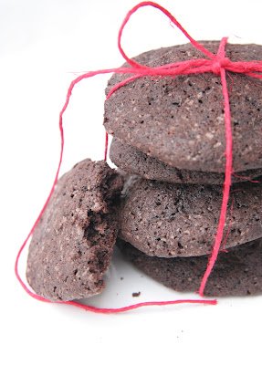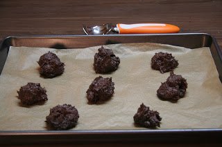 100 g lisztet elkevertem 50g holland kakaóval, fél tk szódabikarbónával, fél tk sóval. Egy másik tálban elkevertem 120 g vajat 200 g barna cukorral és 2 egész tojással. Ezt összekevertem a lisztes cuccal, majd 200 g apróra vágott étcsokit adtam hozzá. Ez egy nagyon sötét, a fentieknél lágyabb massza lett. Fagyiskanállal kis gombócokat formáltam, / szerintem az én fagyiskanalam kicsit kisebb, mint az átlag, Tupper kanál / sütőpapíron előmelegített, 180 fokos sütőben, egymástól kb 10 cm-re rakva 15 percig sültek.