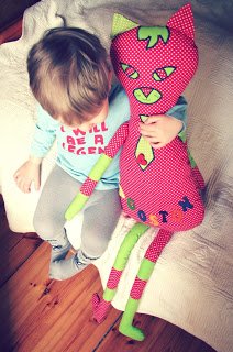 Szóval kezdett összeállni a kép, hogy mit szeretnék. Cica legyen textilből, színes, pihe puha, szeretgethető, nyúzható, ölelhető, húzhat-vonható és természetesen legyen ráírva a fiúcska neve.